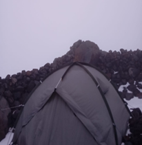 Bu planı olduğu gibi gerçekleştirdim. 4100’de Orlinoye dağ evinde su şişelerimi doldurmak için mola verdim. Burayı Sergey isminde bir Yakut işletiyor. Burda kalıp bir gün aklimitize çalışması yapılıp ertesi gün burdan zirve denenebilir. Ben buradaki kullandığım suları kuyuya gidip tekrar doldurdum. Bu sebeple Sergey nişan gibi bir arma hediye etti bana. Sonrasında 4300’ varıp kampımı kurdum. Şansıma en kıyak yer boştu hemen kuruldum buraya. Elbrus karadenizdeki yüksek hava basıncı sebebi ile sürekli şiddetli rüzgar alan bir dağ. Bu sebeple çadırınızın etrafında mutlaka bir duvar olması iyi olur. Benim kamp attığım yerde halihazırda duvar örülmüştü. Konumu ekleyeceğim. Bu gece burda kaldım. Gece hem dolu yağışı hem de şiddetli bir fırtına vardı. Dondum içeride.